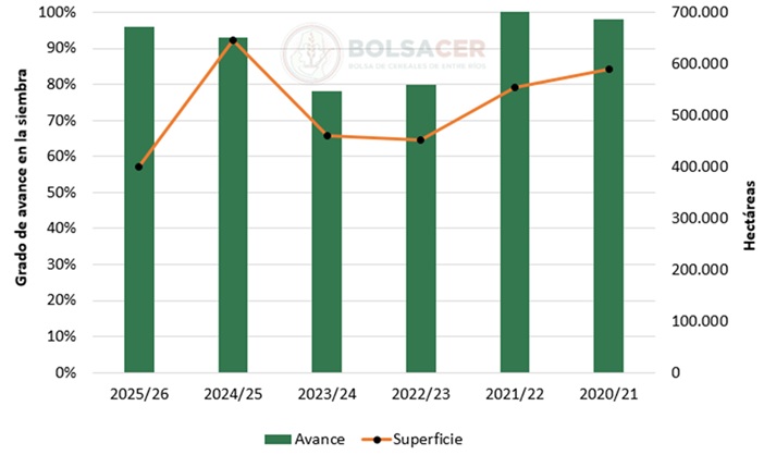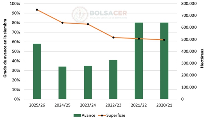 A nivel provincial, se estima un avance del 58 % de la intención de siembra. Si bien este valor relativo es inferior a lo registrado en los ciclos 2021/22 y 2020/21, en términos absolutos el área ya implantada —435.000 hectáreas— supera a las alcanzadas en esos ciclos (405.000 y 398.000 hectáreas, respectivamente).
