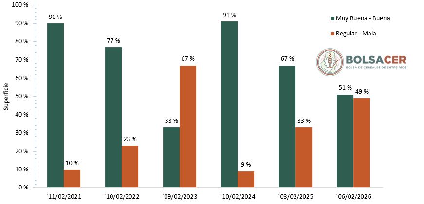 La suma de las categorías Buena y Muy buena y Buena registró una caída de 42 puntos porcentuales, ubicándose actualmente en 51%, teniendo en cuenta que al 15 de enero del 2026, abarcaban el 93% del área implantada.