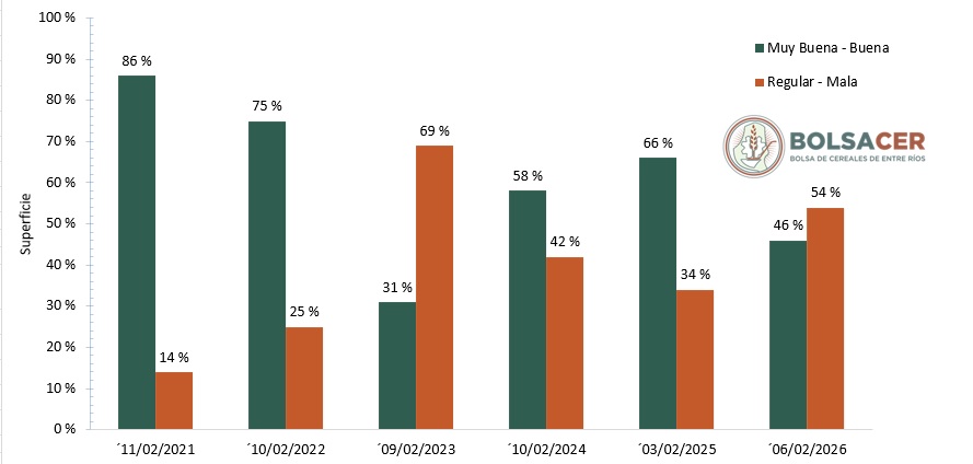 En el área evaluada, la suma de las condiciones Muy Buena y Buena alcanza el 46%, lo que representa una caída de 33 puntos porcentuales respecto de la última evaluación realizada el 18 de enero de 2026, donde abarcaba el 79% del área sembrada.