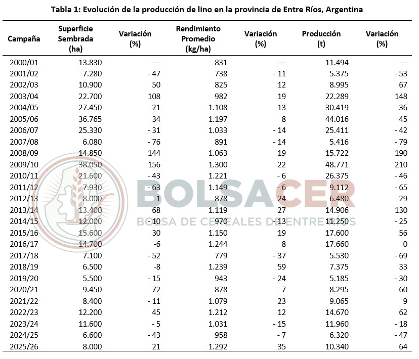 La Bolsa de Cereales de Entre Ríos da a conocer el informe correspondiente a la producción de lino en el ciclo 2025/26 en la provincia de Entre Ríos, Argentina.