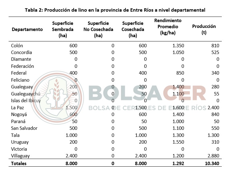 Los datos estadísticos sobre la superficie implantada con lino a nivel departamental se presentan en la Tabla 2.