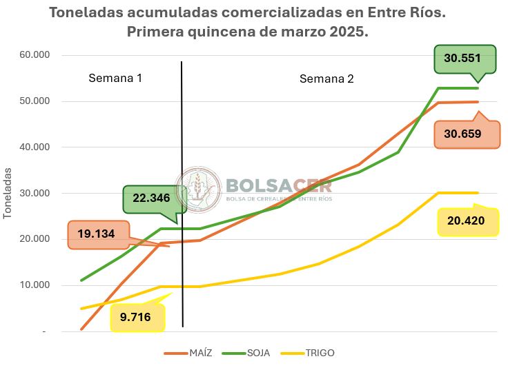 Figura 1. Toneladas comercializadas acumuladas en la primera quincena de marzo de 2025 en Entre Ríos. Fuente: BOLSACER en base a SIO Granos.