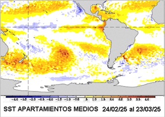 Por estas fechas y si bien sobre la zona oeste de la cuenca del Pacifico Ecuatorial, aun se observan enfriamientos, los mismos son compensados en el resto del área central. Esto deriva en promedios de temperatura que no presentan un apartamiento negativo suficiente como para sostener el fenómeno La Niña. En términos prácticos el indicador ENSO se halla en estado neutral y las anomalías climáticas responden a la circulación de escala regional.