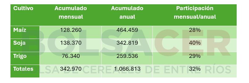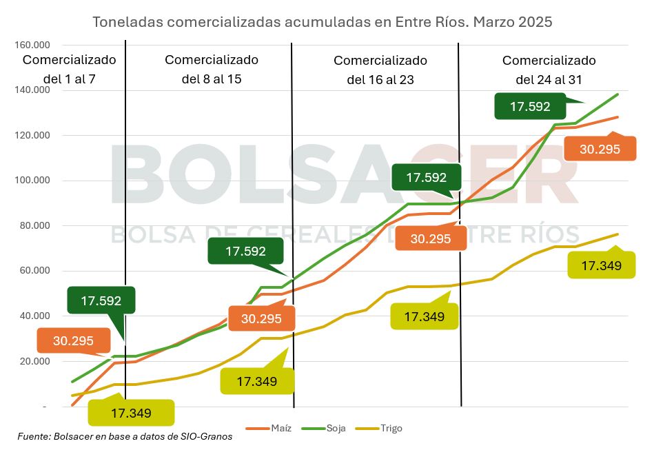Figura 1. Toneladas comercializadas acumuladas en el mes de marzo de 2025 en Entre Ríos. Fuente: BOLSACER en base a SIO Granos.