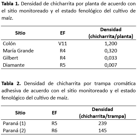 A continuación, se detallan los estados fenológicos y los valores correspondientes a la densidad poblacional de adultos de chicharritas por planta (Tabla 1) y por trampa cromática adhesiva (Tabla 2), en los cultivos relevados de la provincia, pertenecientes a la Red de Monitoreo del Centro Regional Entre Ríos de INTA.