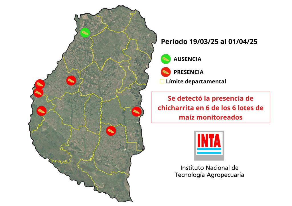 El INTA Entre Ríos informa que, se registró la presencia de adultos de Dalbulus maidis en los 6 lotes de maíz donde se realiza monitoreo mediante observación visual de plantas, red de arrastre y trampas cromáticas adhesivas (ver mapa). Asimismo, en un lote de alfalfa (cultivo no hospedante) ubicado en La Paz, no se registraron adultos de chicharritas.