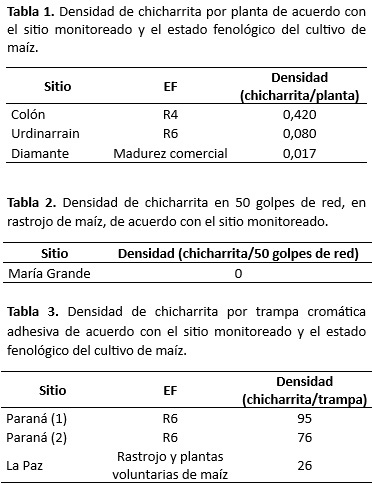 A continuación, se detallan los estados fenológicos y los valores correspondientes a la densidad poblacional de adultos de chicharritas por planta (Tabla 1), en 50 golpes de red (Tabla 2) y por trampa cromática adhesiva (Tabla 3), en los cultivos relevados de la provincia, pertenecientes a la Red de Monitoreo del Centro Regional Entre Ríos de INTA.