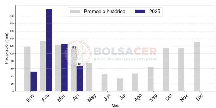 Durante abril de 2025, las precipitaciones en la provincia de Entre Ríos mostraron un comportamiento significativamente inferior al promedio histórico (ver Figura 1).