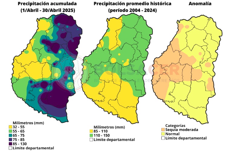 Con estos registros, el acumulado anual hasta abril asciende a 445 mm, mientras que el promedio histórico para el mismo período es de 490 mm, reflejando un déficit acumulado de 45 mm o el equivalente a una reducción del 9 %.