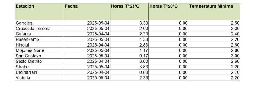 Según los registros de la red, localidades como Strobel, Sexto Distrito, Corrales e Hinojal reportaron entre 2 y 4 horas consecutivas con temperaturas iguales o inferiores a 3 °C, sin alcanzar los umbrales de helada meteorológica (≤ 0 °C). Los valores mínimos registrados en estas estaciones oscilaron entre 2,2 y 2,6 °C, dentro del rango crítico para cultivos sensibles.