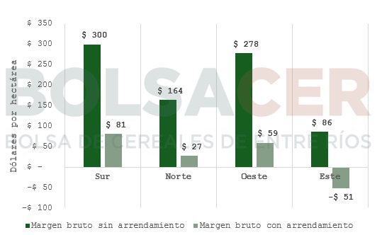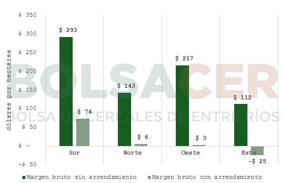 Al analizar el rendimiento esperado por zonas, se observa un mayor margen bruto positivo para los productores de la zona Sur, donde se observan los mejores rindes, promediando 77 U$S/ha por hectárea en campos arrendados considerando la soja total. Es destacable también el margen obtenido en la zona Oeste, ya que en soja de primera se obtienen beneficios muy levemente positivos, pero en soja de segunda se observa buena rentabilidad, cercana a 59 U$S/ha. Además, actualmente los productores arrendatarios de la zona Este enfrentarían pérdidas de alrededor de 25 dólares por hectárea en soja de primera y de 51 dólares por hectárea en soja de segunda, ya que su rendimiento es insuficiente para cubrir los costos.