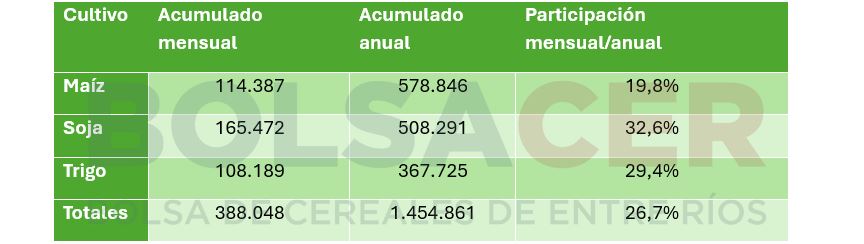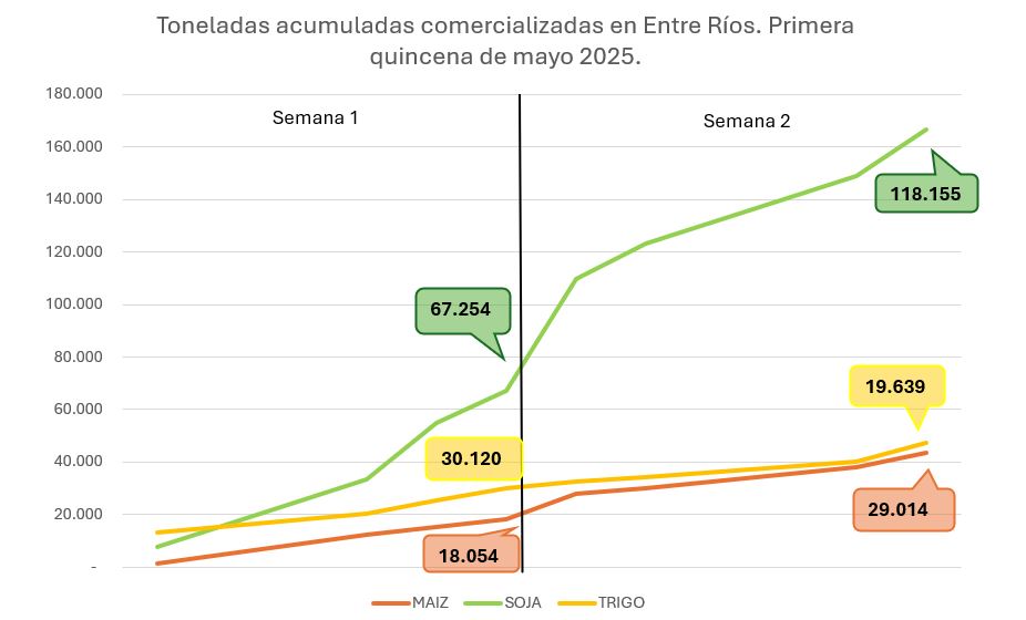 Figura 1. Toneladas comercializadas acumuladas en la primera quincena de mayo de 2025 en Entre Ríos. Fuente: BOLSACER en base a SIO Granos.