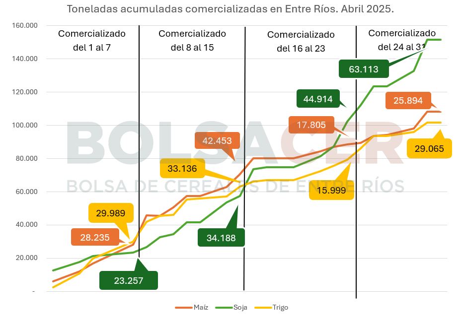 Figura 1. Toneladas comercializadas acumuladas en el mes de abril de 2025 en Entre Ríos. Fuente: BOLSACER en base a SIO Granos.