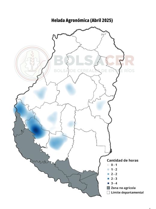 El mapa evidencia que los sectores más afectados por la persistencia del frío se concentraron en el centro-oeste del territorio provincial, especialmente en áreas de los departamentos Paraná, Victoria, Diamante, Nogoyá y Gualeguay. En estas zonas, se acumularon entre 2 y 4 horas consecutivas por debajo del umbral agronómico, lo que indica un potencial riesgo para cultivos en estadios fenológicos sensibles.