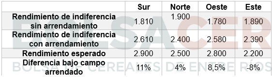 Tabla 1. Rendimientos de indiferencia y proyectados para soja de primera, en kilos.