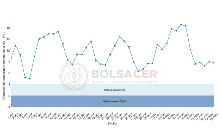 Figura 1: Evolución diaria del promedio de temperatura mínima en la red BolsaCER entre el 1 de abril y el 14 de mayo de 2025. Se indican los umbrales para heladas agronómicas (≤ 3 °C) y meteorológicas (≤ 0 °C).