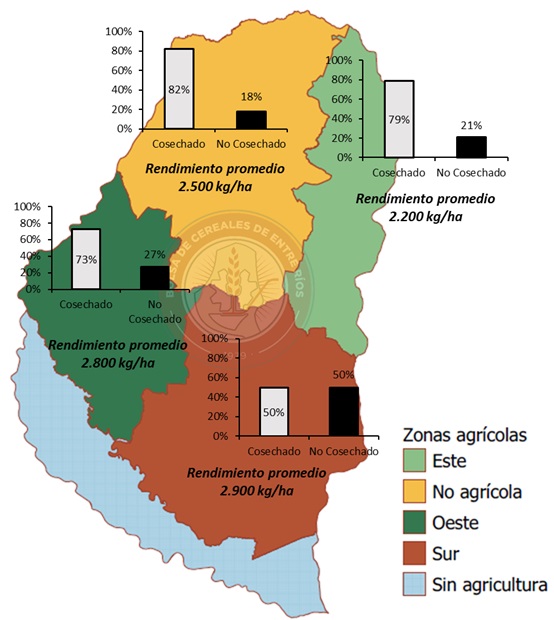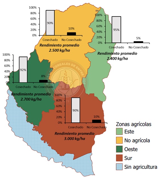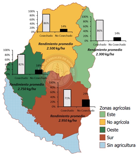 Figura 1: Avance de cosecha de soja de primera y rendimiento promedio por zonas productivas en la provincia de Entre Ríos.