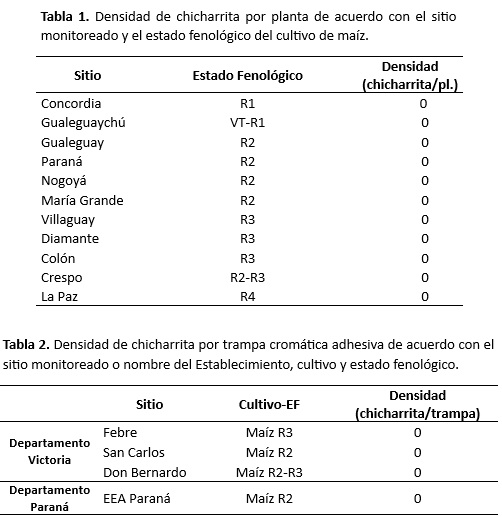 A continuación, se detallan los estados fenológicos y los valores correspondientes a la densidad poblacional de adultos de chicharritas por planta (Tabla 1, observación directa, 50 plantas de maíz). Además, se presentan datos provenientes de las capturas en trampas cromáticas adhesivas (Tabla 2), pertenecientes a profesionales del Círculo de Ingenieros Agrónomos de Victoria (CIAV) y de la EEA Paraná del INTA.