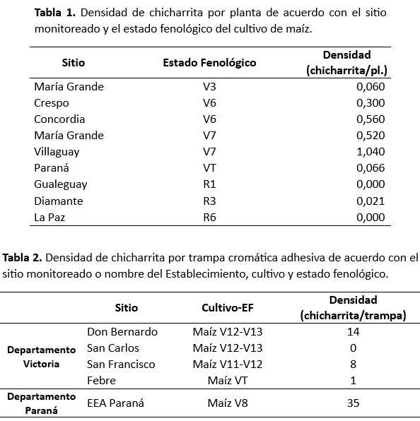 A continuación, se detallan los estados fenológicos y los valores correspondientes a la densidad poblacional de adultos de chicharritas por planta (Tabla 1, observación directa, 50 plantas de maíz o 160 golpes de red). Además, se presentan datos provenientes de las capturas en trampas cromáticas adhesivas (Tabla 2), pertenecientes a profesionales del Círculo de Ingenieros Agrónomos de Victoria (CIAV), de la AER Victoria y de la EEA Paraná del INTA.