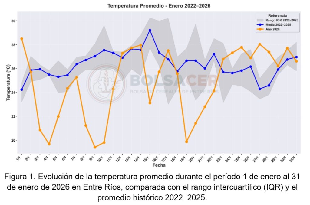 El comportamiento de la temperatura promedio durante enero de 2026 exhibió dos fases climáticas bien diferenciadas. Mientras que la primera quincena estuvo dominada por una fuerte inestabilidad y temperaturas bajas (registros por debajo de la media histórica y del rango intercuartílico), la segunda mitad del mes mostró una transición hacia una recuperación térmica sostenida, finalizando el período con valores superiores al promedio histórico 2022–2025.