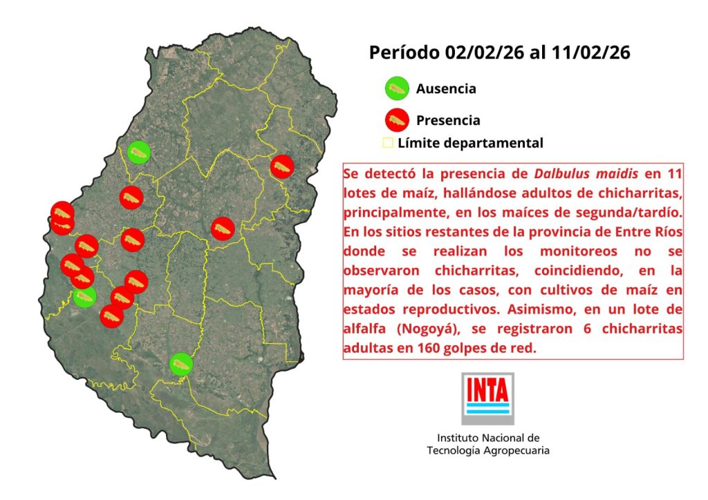 Se detectó la presencia de Dalbulus maidis en 11 lotes de maíz, hallándose adultos de chicharritas, principalmente, en los maíces de segunda/tardío. En los sitios restantes de la provincia de Entre Ríos donde se realizan los monitoreos no se observaron chicharritas, coincidiendo, en la mayoría de los casos, con cultivos de maíz en estados reproductivos (Ver mapa). Asimismo, en un lote de alfalfa (Nogoyá), se registraron 6 chicharritas adultas en 160 golpes de red.