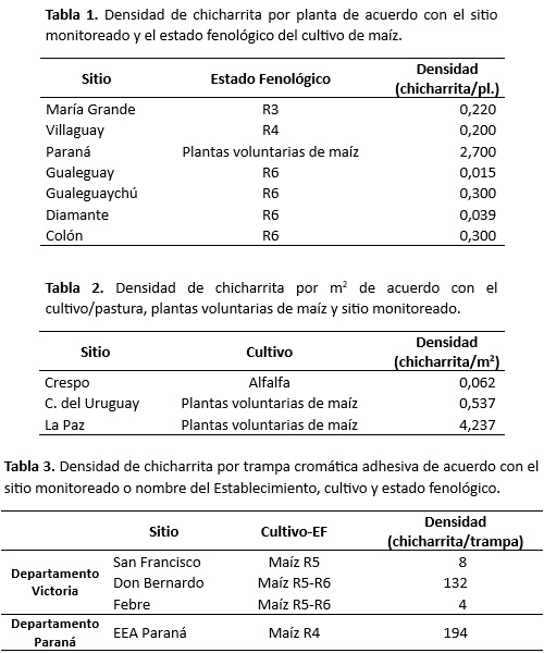 A continuación, se detallan los estados fenológicos y los valores correspondientes a la densidad poblacional de adultos de chicharritas por planta (Tabla 1, observación directa, 50 plantas de maíz o 160 golpes de red) como así también la densidad de chicharritas por m2 en plantas voluntarias de maíz y en cultivo de alfalfa (Tabla 2, 160 golpes de red). Además, se presentan datos provenientes de las capturas en trampas cromáticas adhesivas (Tabla 3), pertenecientes a profesionales del Círculo de Ingenieros Agrónomos de Victoria (CIAV), de la AER Victoria y de la EEA Paraná del INTA.