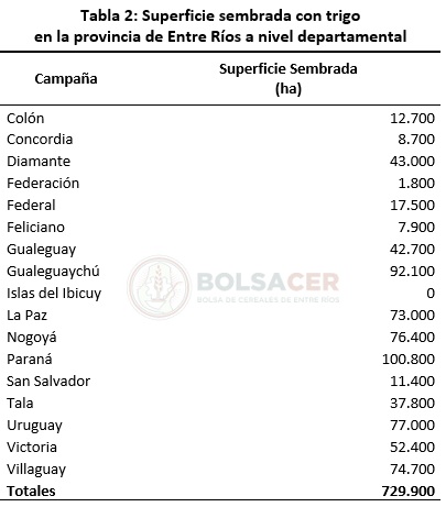 Los datos estadísticos sobre la superficie implantada con trigo a nivel departamental se presentan en la Tabla 2.