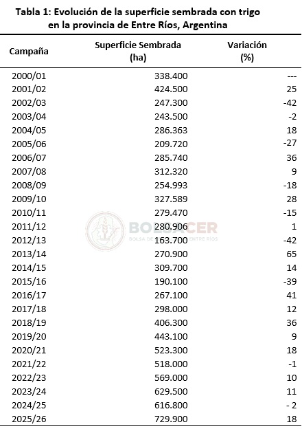 La Bolsa de Cereales de Entre Ríos da a conocer el informe correspondiente a la superficie sembrada con trigo en el ciclo 2025/26 en la provincia de Entre Ríos, Argentina.