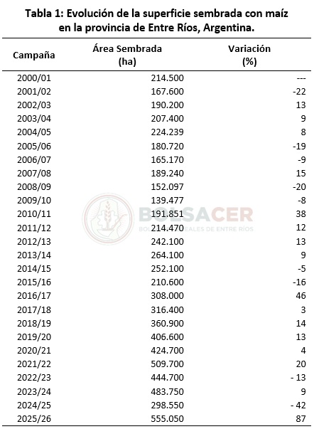 En la provincia de Entre Ríos, la superficie cultivada con maíz durante el ciclo 2025/26 alcanzó las 555.050 ha, lo que representó un crecimiento interanual del 87% respecto del ciclo anterior y constituyó la mayor área sembrada desde el inicio de la serie en el ciclo 2000/01, con lo cual se superó el récord previo de 509.700 ha registrado en 2021/22.