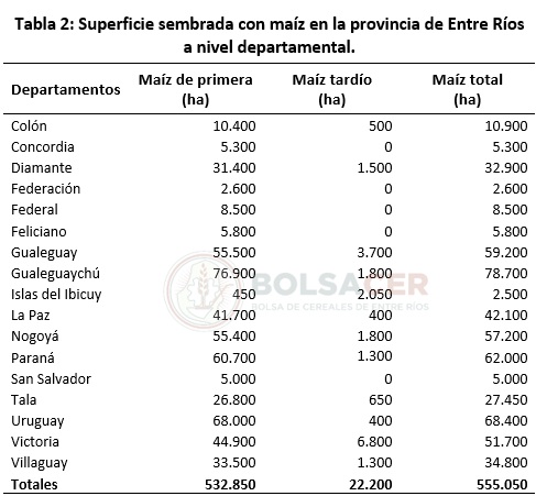 Los datos estadísticos sobre la superficie implantada con maíz a nivel departamental se presentan en la Tabla 2.