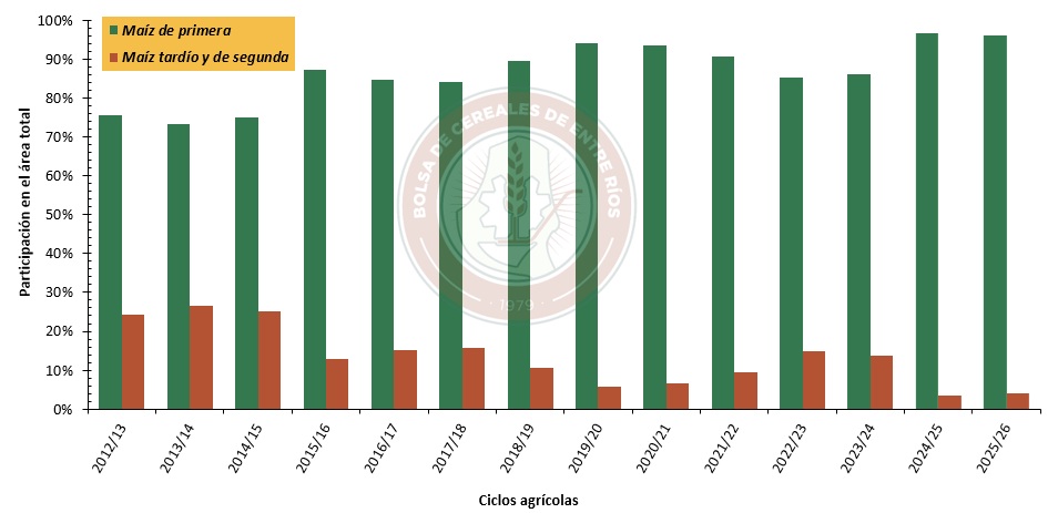 Figura 1: Evolución de la participación del maíz de primera versus el tardío y de segunda en la provincia de Entre Ríos.
