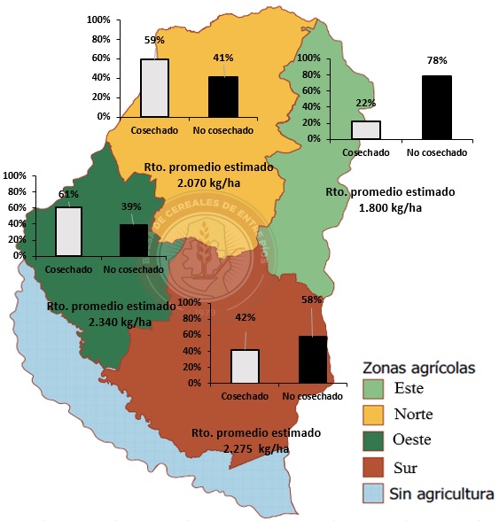 Figura 1: Avance de cosecha y rendimiento promdedio por zona de la Provincia