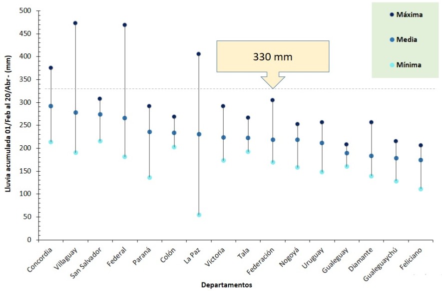 «Del 01 de febrero al 20 de abril la lluvia promedio acumulada en la región fue de 225 mm, si bien hubo un interesante aporte en el mes de marzo, lamentablemente las tendencias indican que el mes de abril cerrará con valores inferiores a las normales», destacó en su reporte, mientras que, mediante una figura, detalló en orden descendente la precipitación promedio acumulada en cada departamento juntos con los valores extremos registrados.