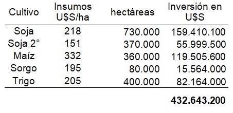 En la Tabla 1 se puede ver la cantidad de dólares a invertir que se requieren para la categoría insumos por cultivo, teniendo en cuenta una estimación de hectáreas a sembrar la presente campaña: