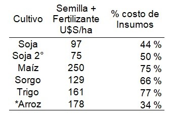 Los insumos mas importantes en la inversión son la semilla y fertilizante, donde podemos ver un gran impacto en las gramíneas (Tabla 2) en el caso de *arroz hay que aclarar que al ser un cultivo bajo riego el mayor costo está dado por el principal insumo que requiere el riego que es gasoil.