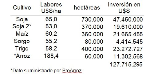 En cuanto al arroz se tuvo en cuenta dos casos: el riego por represa/río (43% de la superficie) y el riego por pozo (57% de la superficie), utilizando gasoil como fuente de energía. Se estima una superficie similar al año anterior de unas 60.000 ha, con un costo promedio de 520 U$S/ha, lo que nos da un total de inversión en insumos requerido por el cultivo de arroz de 31.193.870 U$S. Al agregar el cultivo de arroz para esta campaña la inversión total en la provincia para insumos es de U$S 463.837.070.