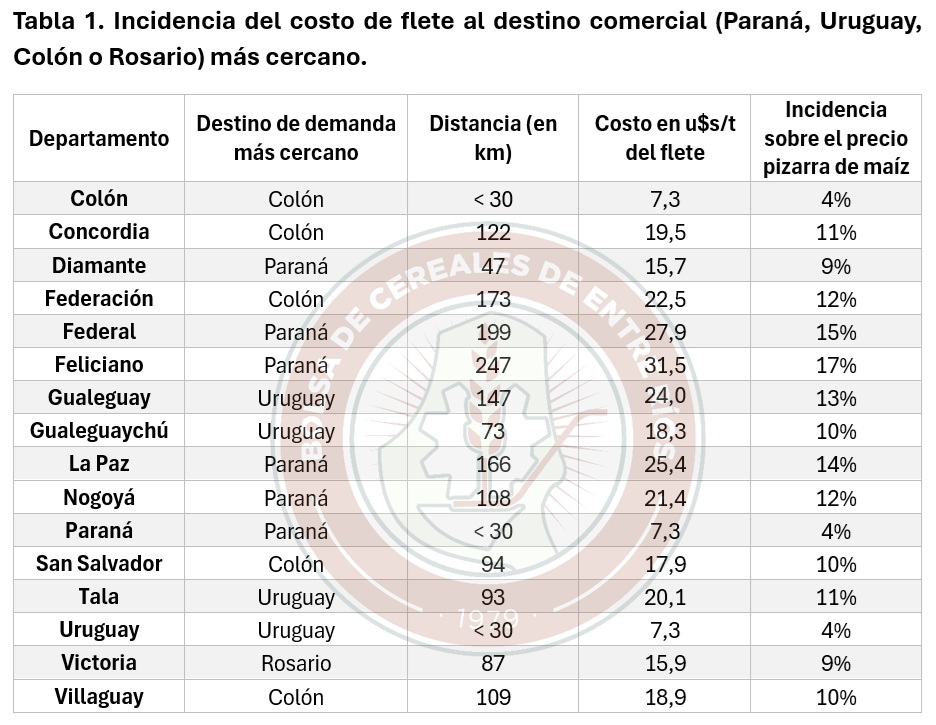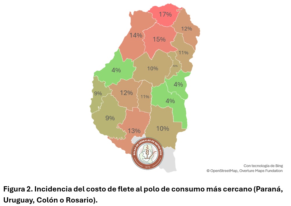 Sin embargo, el destino de exportación (Rosario) no es el único mercado para el maíz. Las estimaciones del SIBER indican que alrededor de 3,1 millones de toneladas se destinan al consumo interno, concentrado en la demanda producida por los sectores animales (principalmente sector avícola), que se concentra en los departamentos de Uruguay (19%), Paraná (15,2%) y Colón (12,7%). Por lo tanto, el maíz entrerriano no enfrenta un costo de flete único, sino que arbitra entre el mercado interno y el destino a puerto.