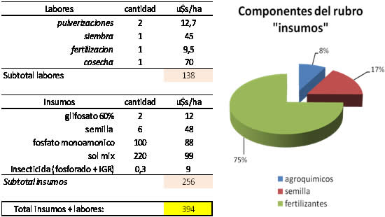 A su vez, brindó datos del costo del cultivo y sus insumos (agroquímicos, semillas y fertilizantes) para colza, realizando una comparación con trigo. Se muestra a continuación un cuadro resumen con los costos de colza: