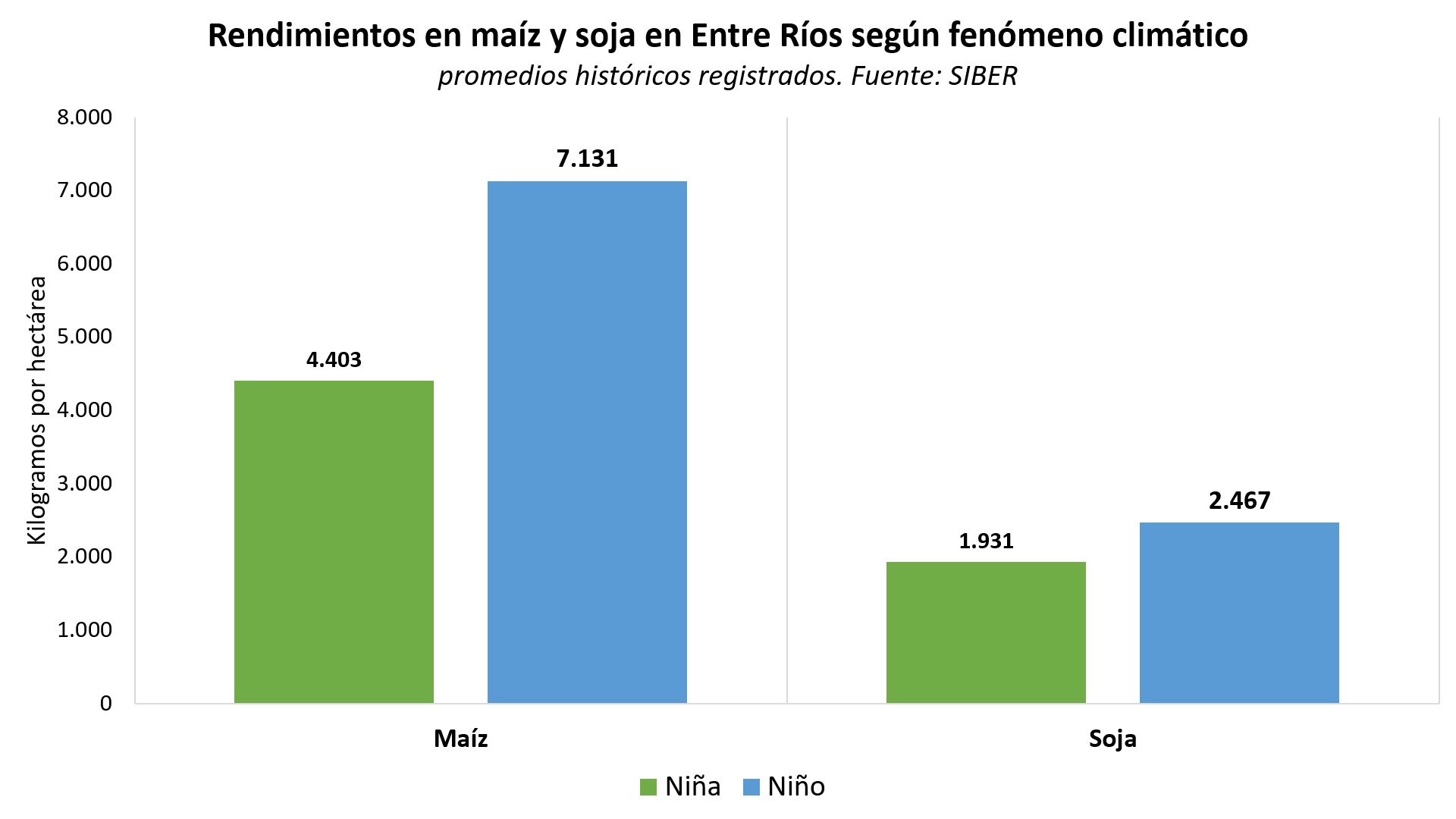 Los rendimientos de maíz y soja están fuertemente vinculados con el fenómeno climático, ya sea El Niño o La Niña, esto se debe a que afectan las lluvias durante el período estival, que es la etapa de crecimiento de estos cultivos.