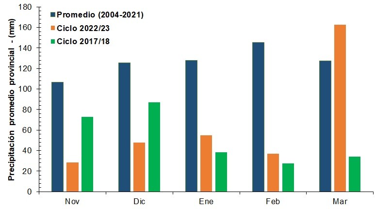 La precipitación promedio acumulada en el periodo noviembre – marzo es de 640 mm. Pero en el ciclo 2017/18 fue de 260 mm, es decir una disminución del 59 % (380 mm) versus el ciclo 2022/23 donde el acumulado se ubicó en 330 mm, lo cual indica una merma del 48 % (310 mm).