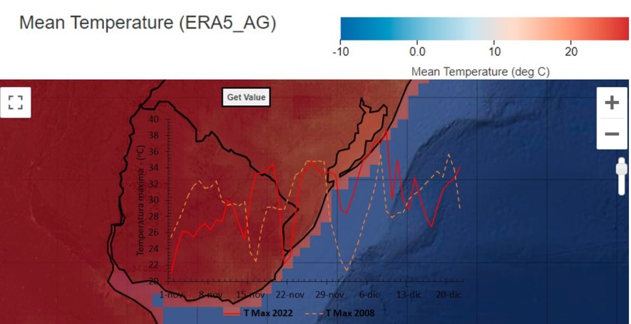 Figura 2: Comportamiento de la temperatura máxima para Entre Ríos en el año 2008 y 2022. Fuente: ECMWF.