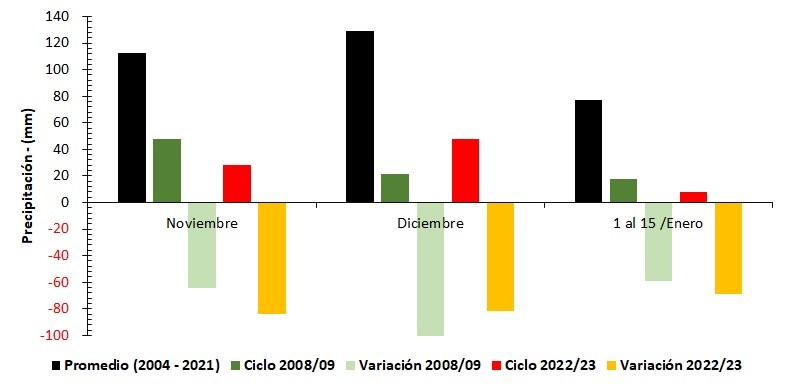 El sistema de información destaca que, tanto para el ciclo 2008/09 como para el 2022/23 se observó un déficit hídrico del 01/Nov al 15/Ene de 230 mm, lo cual equivale a una disminución del 72 %.