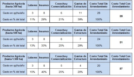 De lo analizado se deduce que el balance productivo para aquellos productores que siembran hasta 300 ha es negativo, ya que el ingreso se situó en 24,6 qq/ha; mientras que el gasto total para el funcionamiento de la empresa fue de 28 qq/ha sin arrendamiento y 35 qq/ha pagando el alquiler de la tierra.