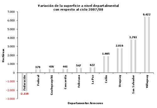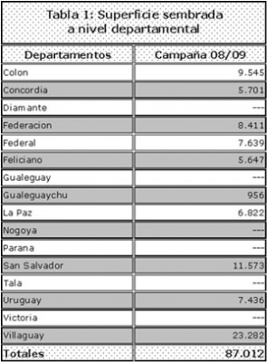 Los departamentos Colón, Uruguay, San Salvador y Villaguay que durante el ciclo anterior totalizaban 36.900 ha, actualmente cuentan con 51.836 ha, lo cual representa un aumento del 40,48%.