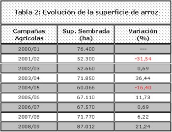 La tabla 2 muestra la evolución de la superficie arrocera en los últimos nueve años, la cual ha sido elaborada con los datos estadísticos históricos de la Institución.