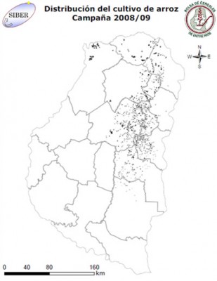 El mapa muestra la distribución geográfica de los lotes de arroz en el ámbito provincial para la presente campaña.