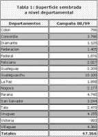 Los valores finales de superficie sembrada en el 2008/09, por departamento y total provincial se detallan en la Tabla 1.