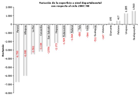 Por otra parte, los departamentos Paraná y Villaguay evidenciaron una fuerte merma de la superficie dedicada al cultivo, seguido de La Paz, Concordia y San Salvador.