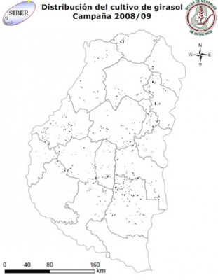La Bolsa de Cereales de Entre Ríos, por medio de su Sistema de Información Agrícola, da a conocer la superficie implantada con Girasol en cada departamento y el total provincial correspondiente a la campaña 2008/09.