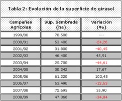 La tabla 2 muestra la evolución de la superficie girasolera durante la última década, la cual ha sido elaborada con los datos estadísticos históricos de la Institución.